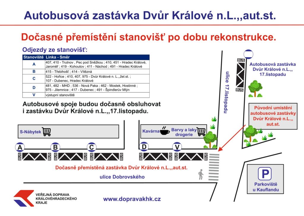 Zastávky Dvůr Králové n.L.,,aut.st. budou přesunuty do ulice Dobrovského. Z prostorových a dopravních důvodů bude po dobu rekonstrukce obsluhována rovněž zastávka Dvůr Králové n.L.,, 17. listopadu, na které zastaví všechny projíždějící spoje a tedy část přestupních vazeb bude realizována i zde (např. Bílá Třemešná – Trutnov).